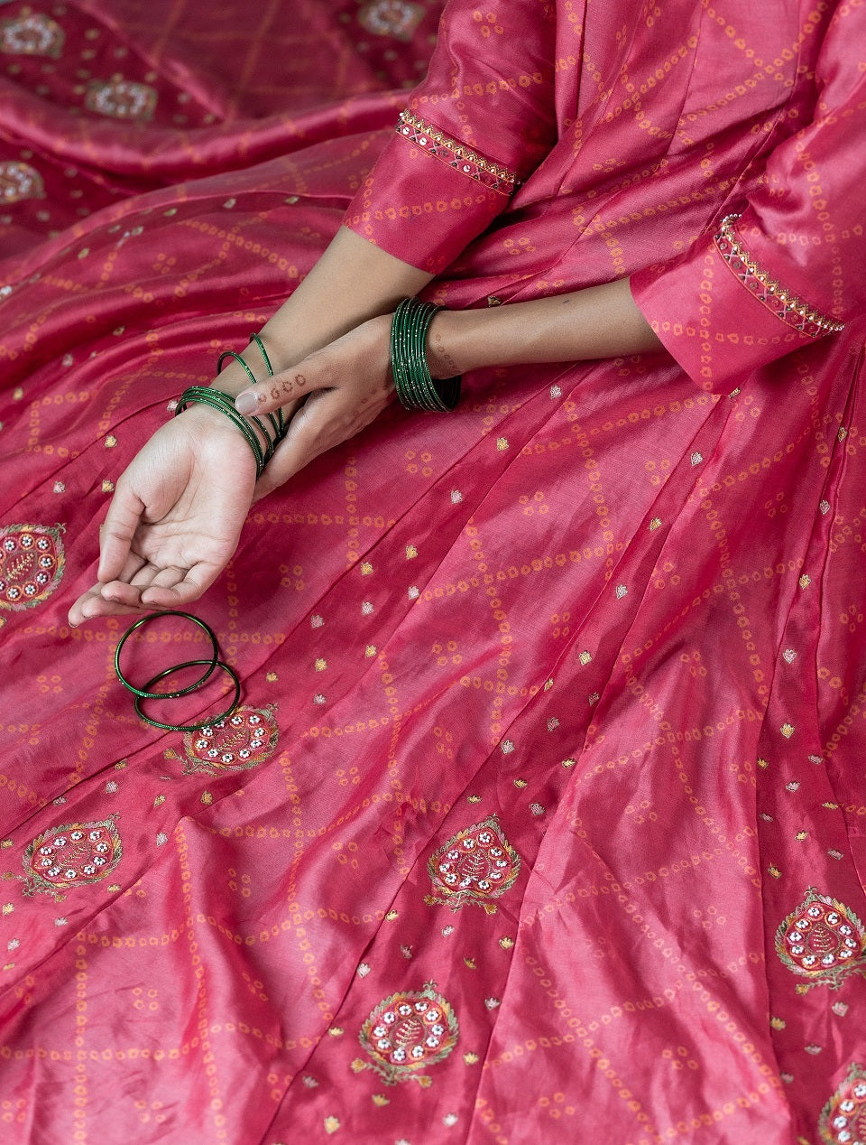 Bandhej printed red chanderi anarkali with embroidery on panels, armhole, neck and sleeves, highlighted with hand tucked motifs, paired with mirrored cotton pants and embroidered chanderi scallop dupatta.
