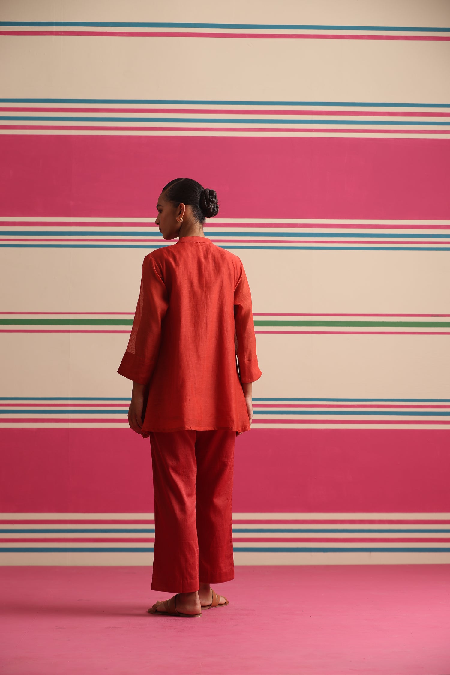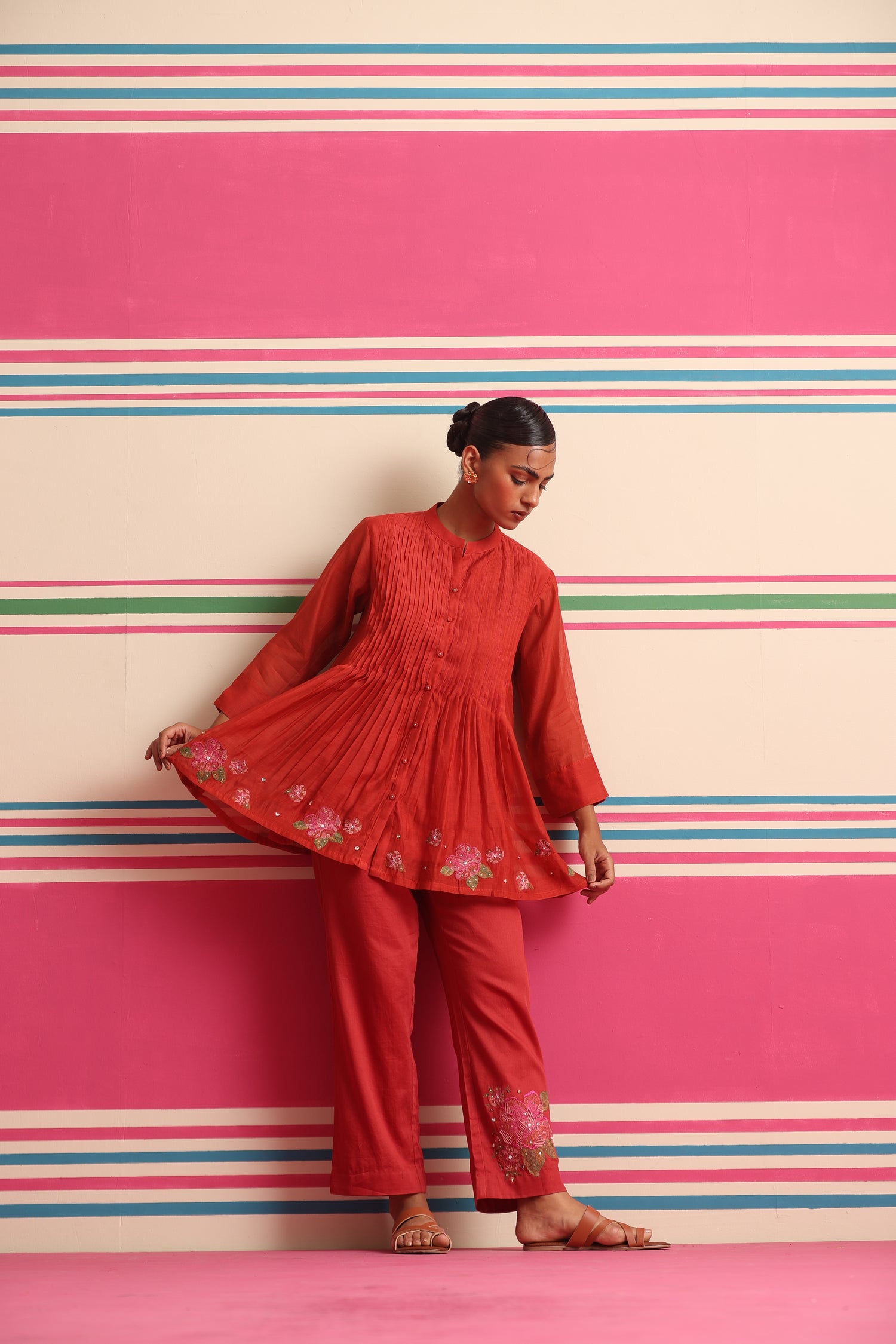 Pure mul chanderi top with floral embroidery highlighted with hand tucked motis and sequins paired with pure cotton satin embroidered pants highlighted with hand tucked motis and sequins.