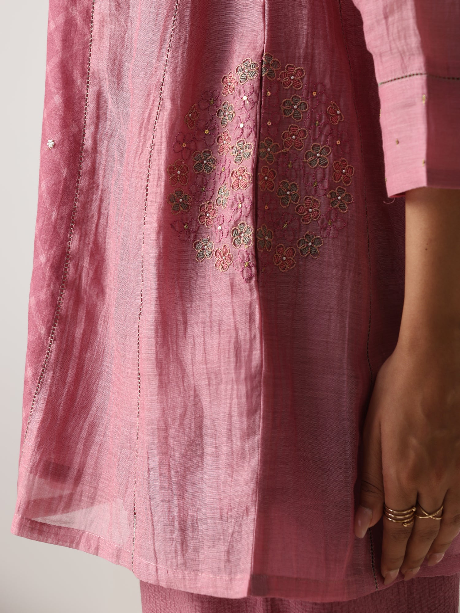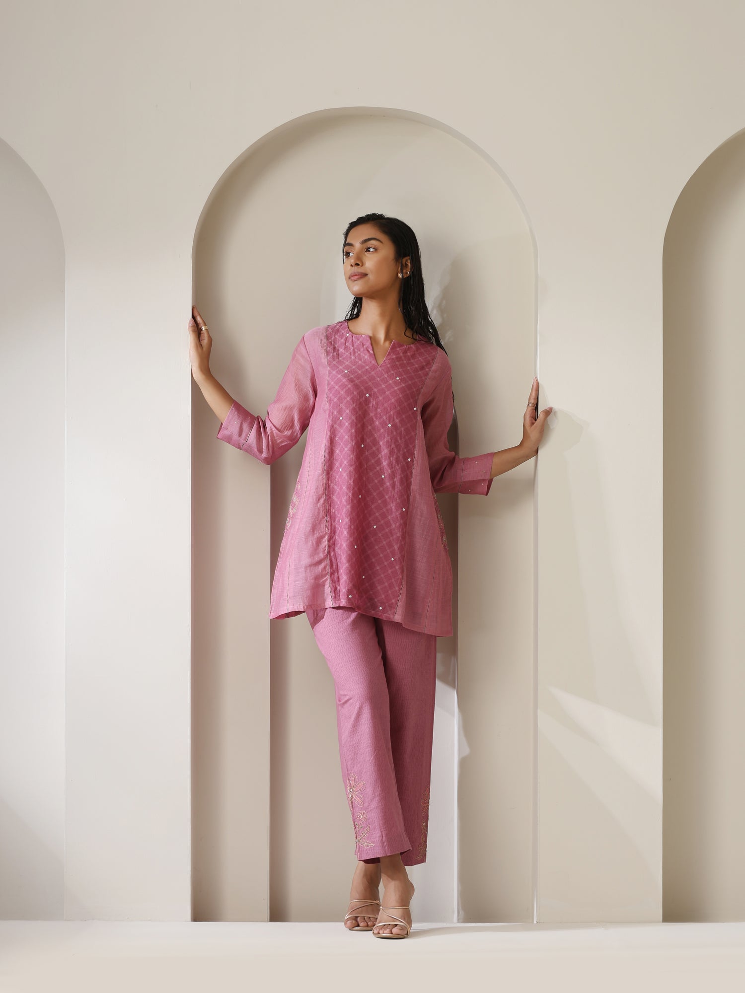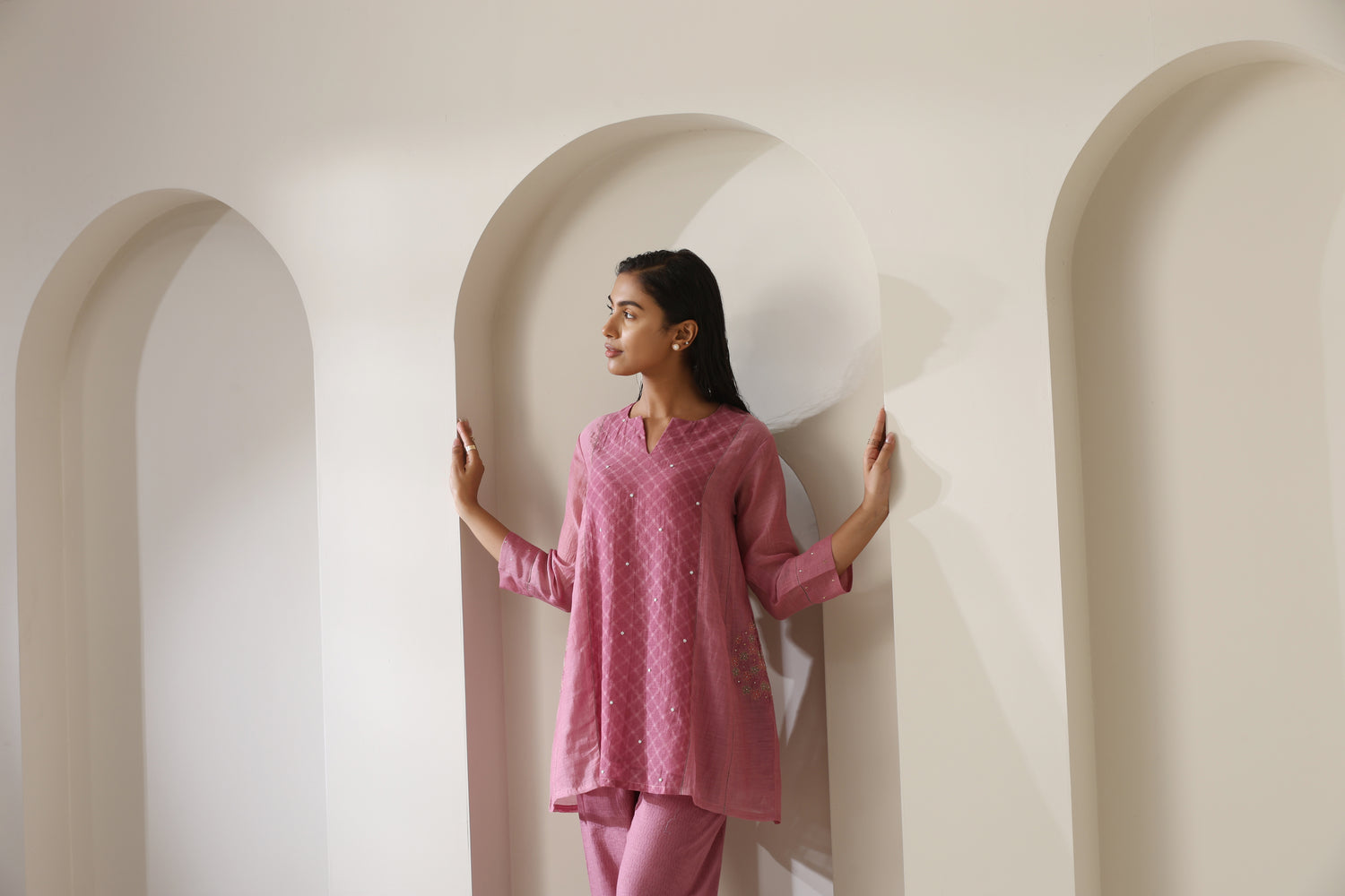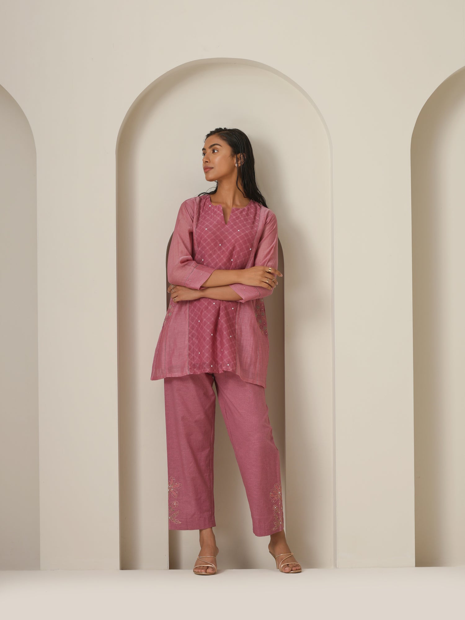 Pure mul chanderi dori embroidered and block printed top highlighted with hand tucked motis and sequins paired with pure cotton linen block printed and embroidered pants