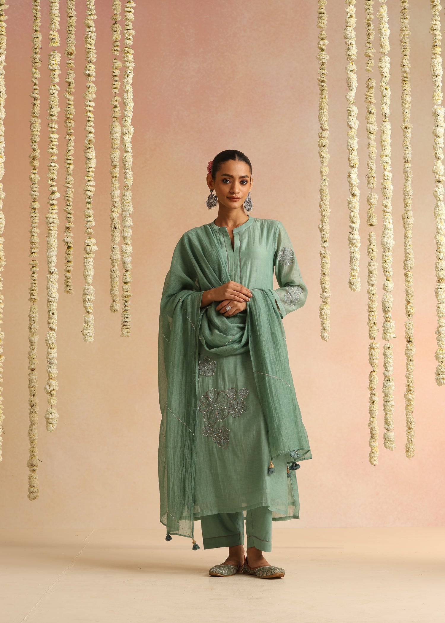 and motis paired with pure cotton satin pants and pure mul chanderi dupatta highlighted with hand tucked motis and sequins.