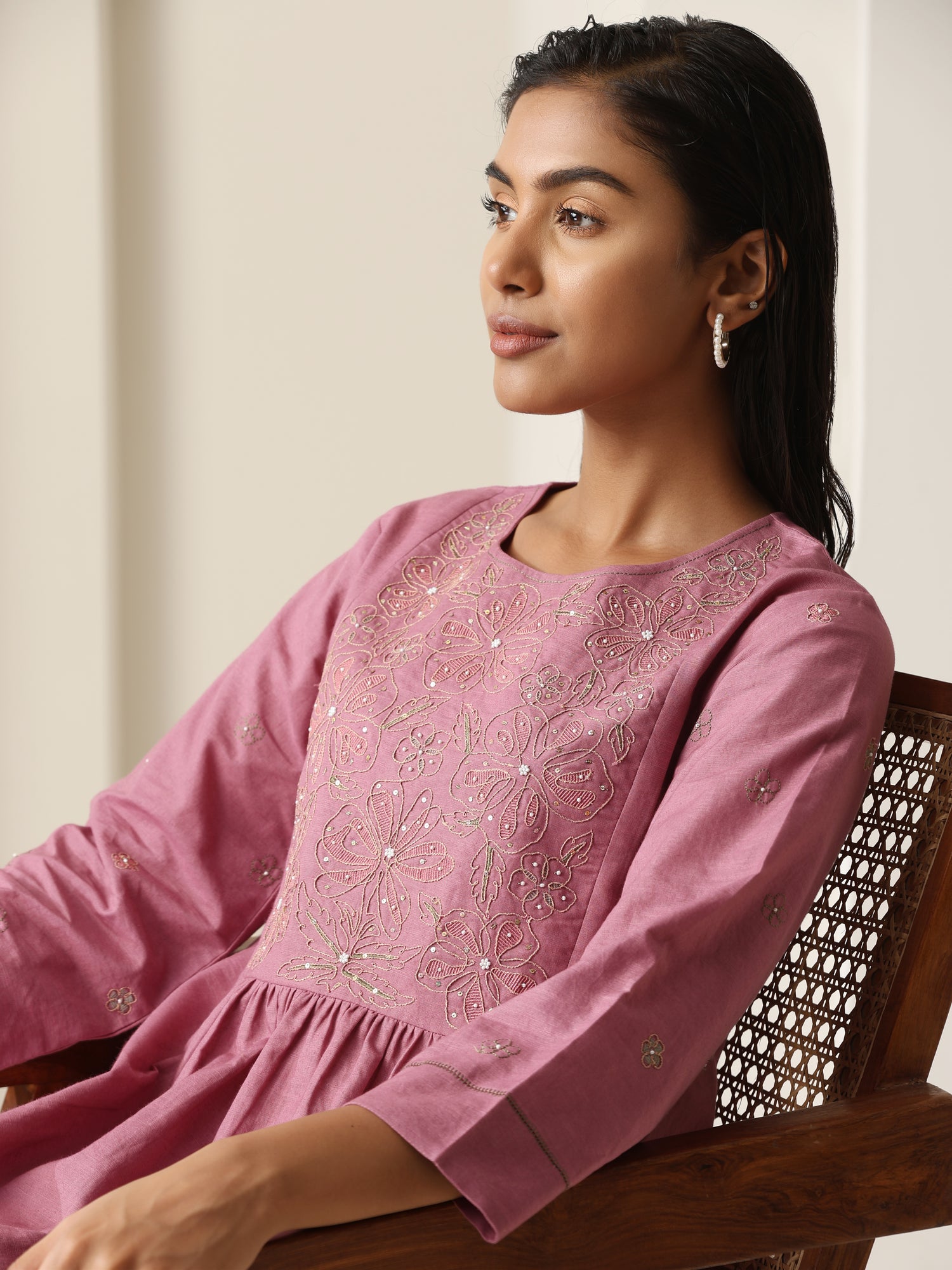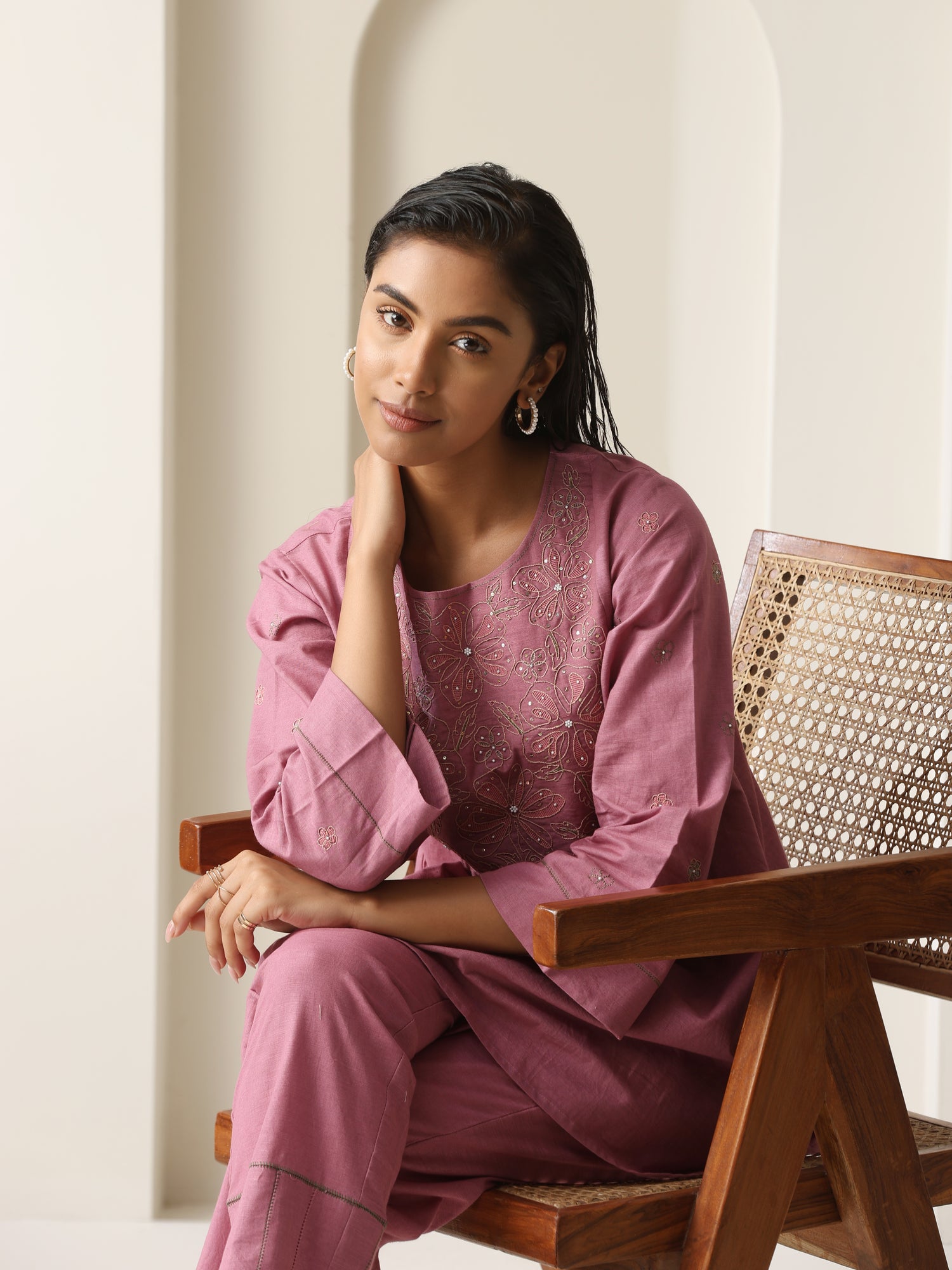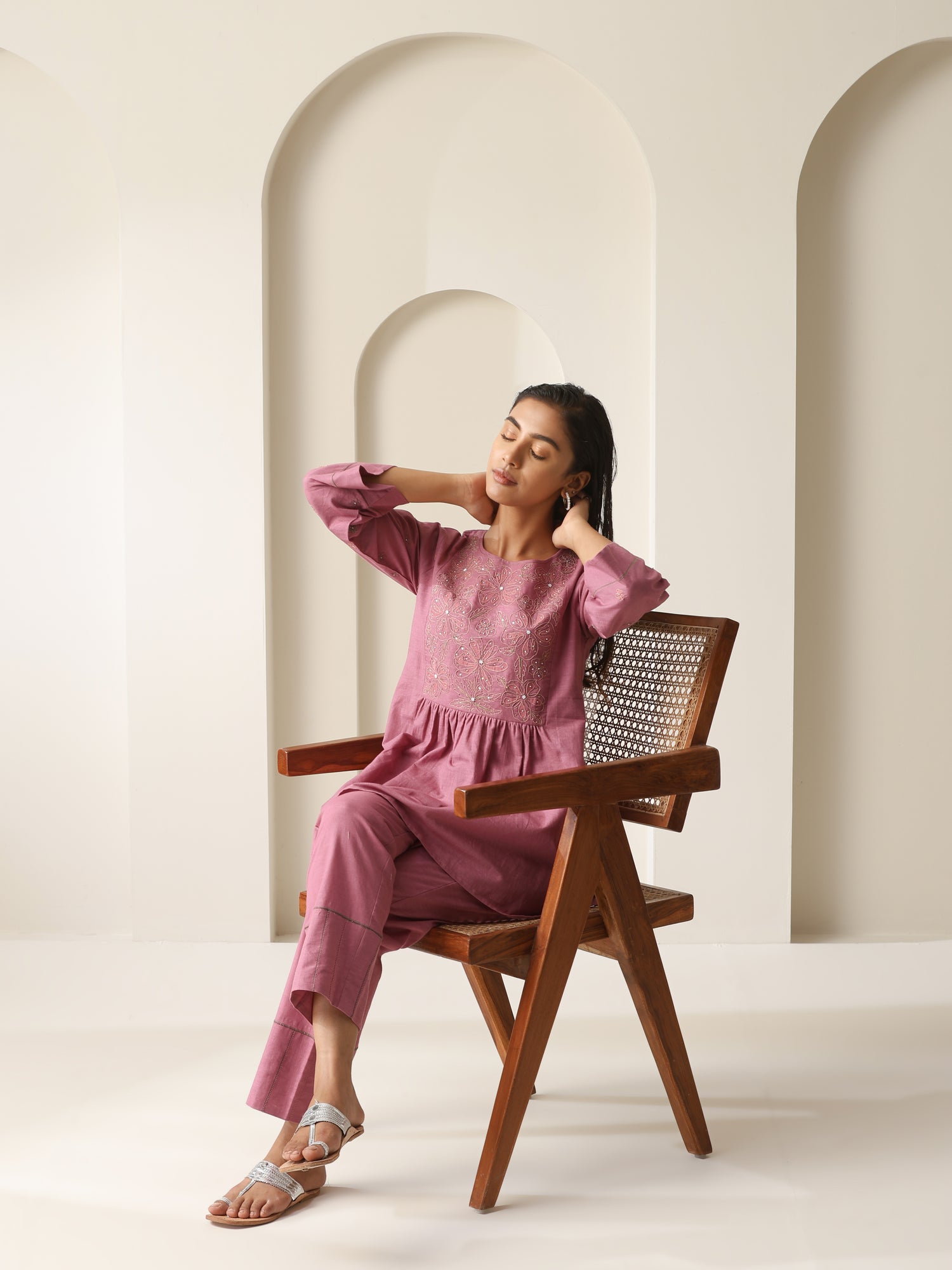 Pure Cotton linen dori embroidered top highlighted with hand tucked motis and sequins paired with pure cotton linen pants