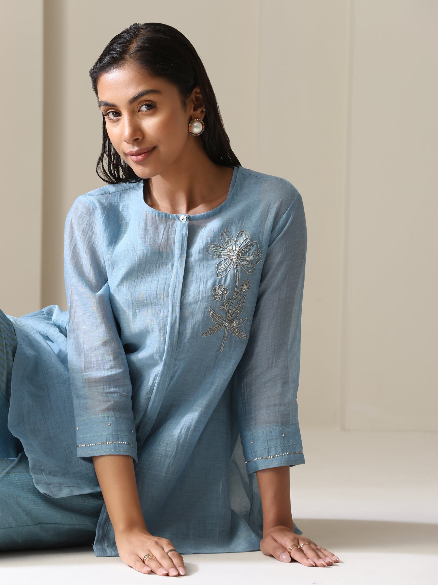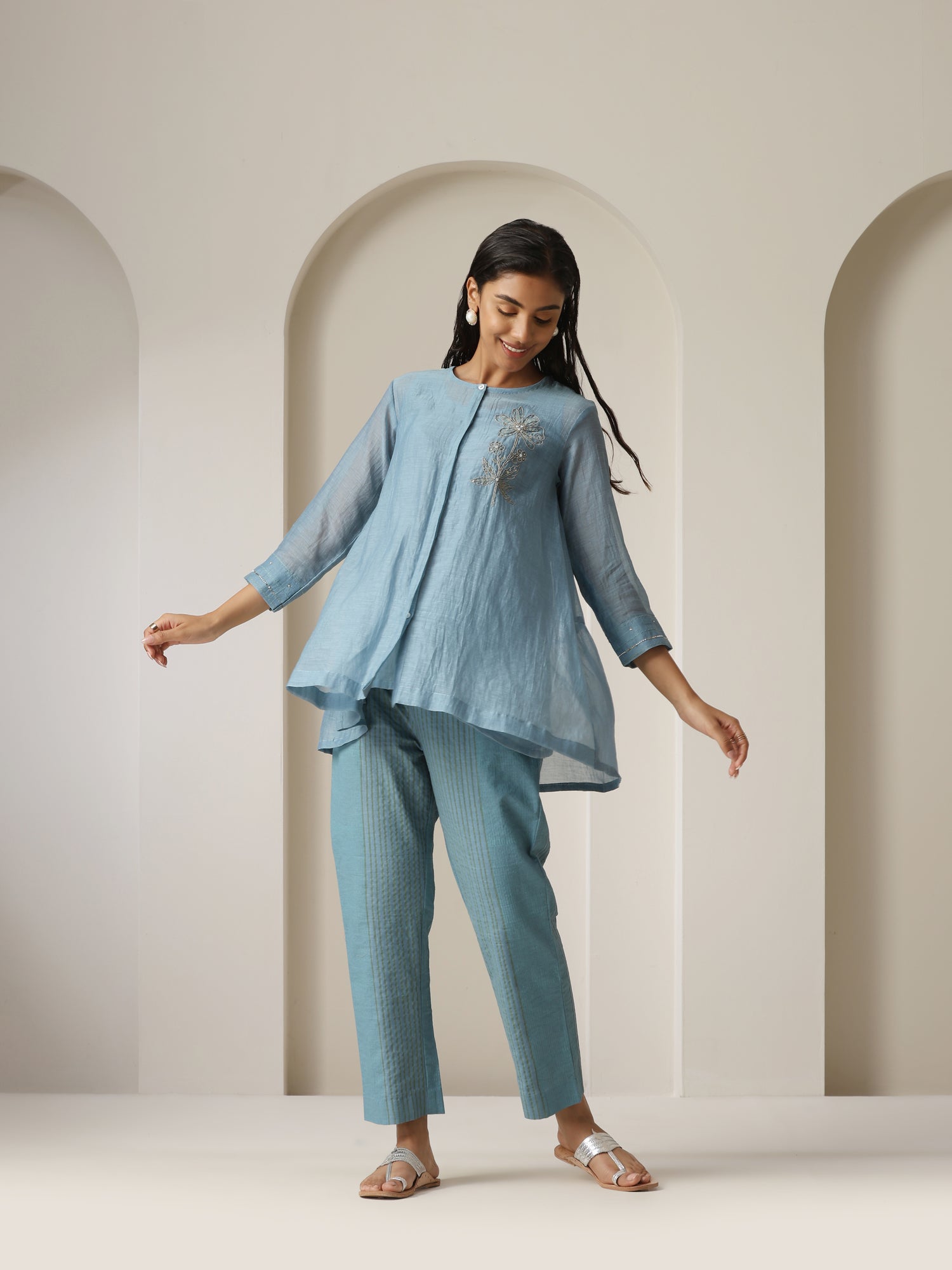 Pure mul chanderi dori embroidered top highlighted with hand tucked motis and sequins with gathered back paired with hand block printed pure cotton linen pants