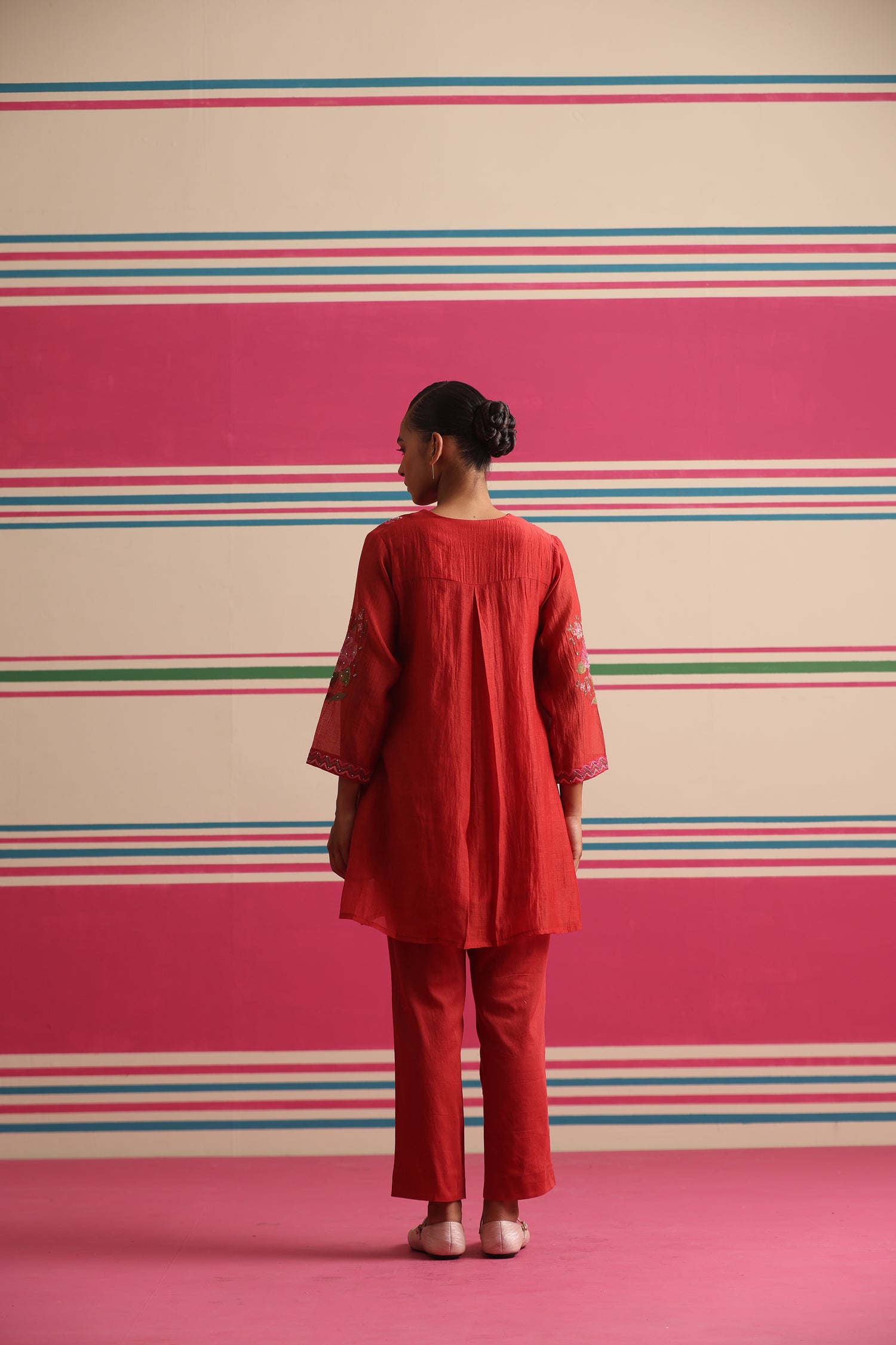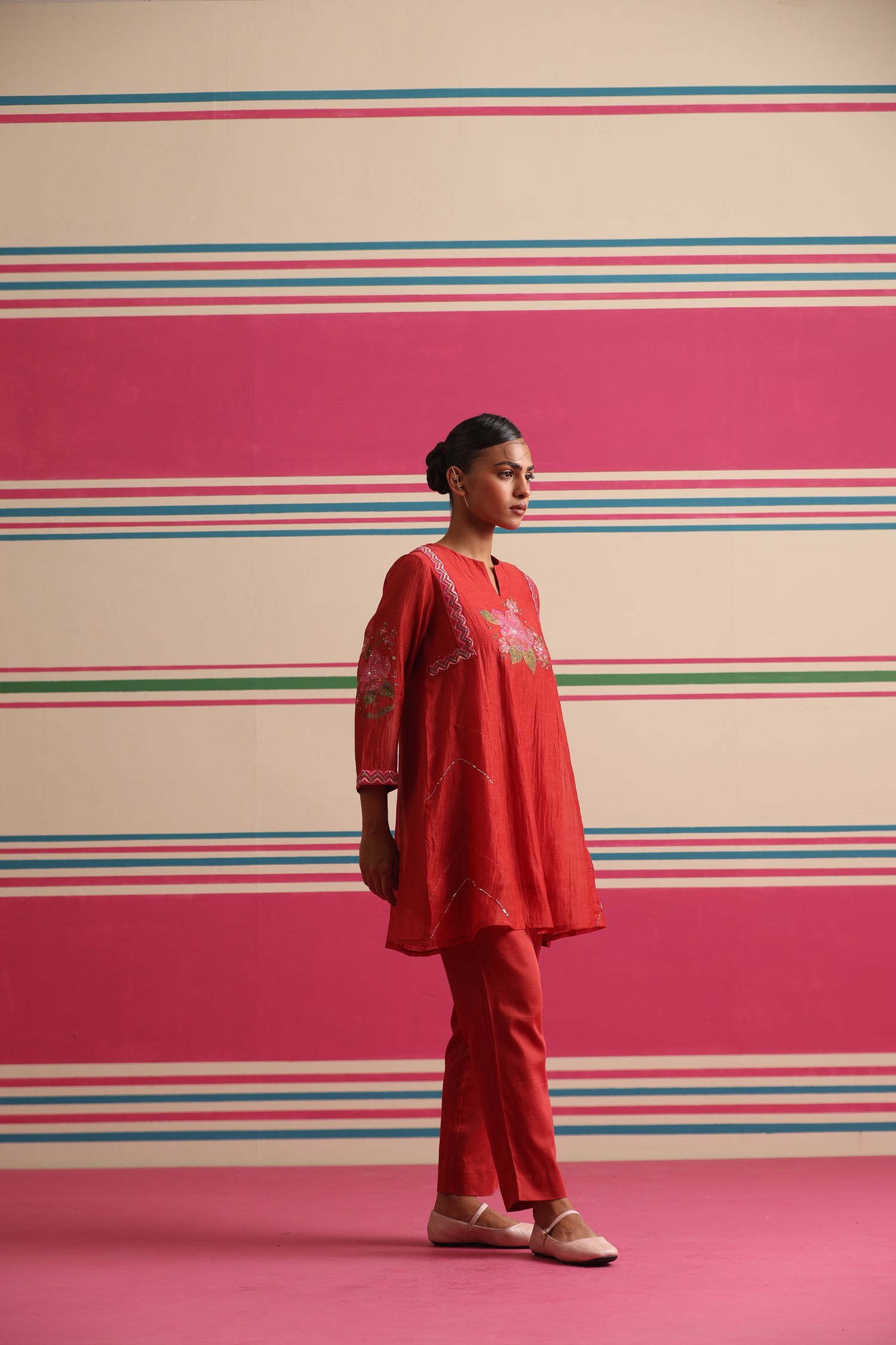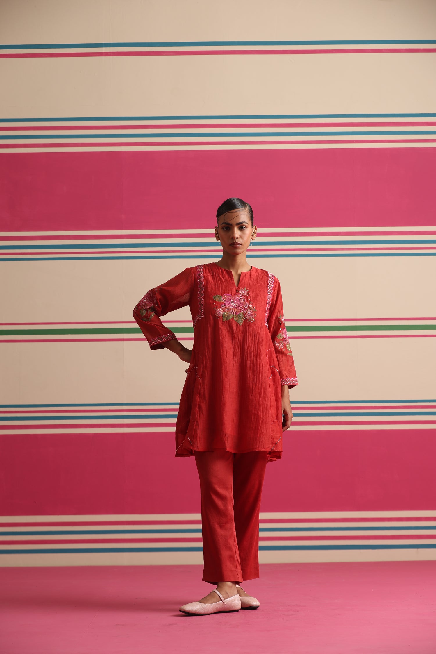 Pure mul chanderi top with floral embroidery highlighted with hand tucked motis and sequins paired with pure cotton satin pants.