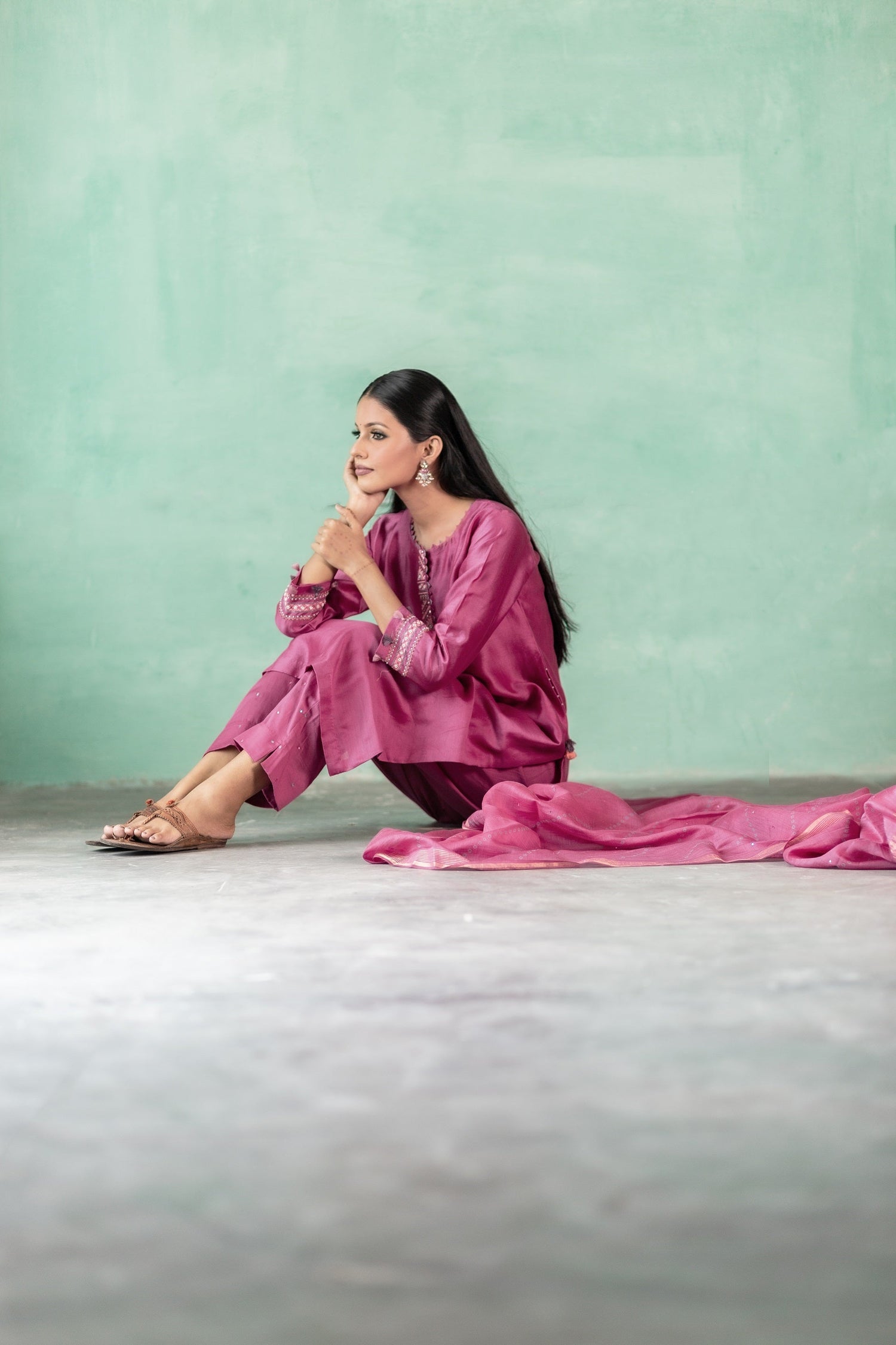 Neck Embroidered Chanderi Kurta Set - Pink (RTS)