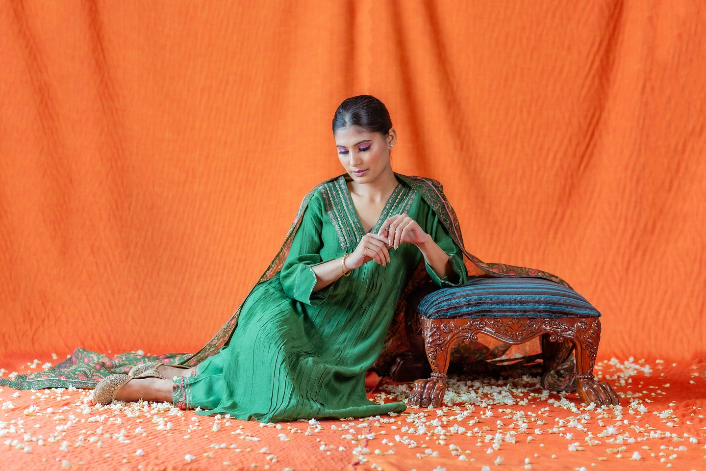 Green chanderi V-Neck kurta with embroidered neck line and sleeves paired with printed chanderi dupatta finished with embroidered border and cotton pants.