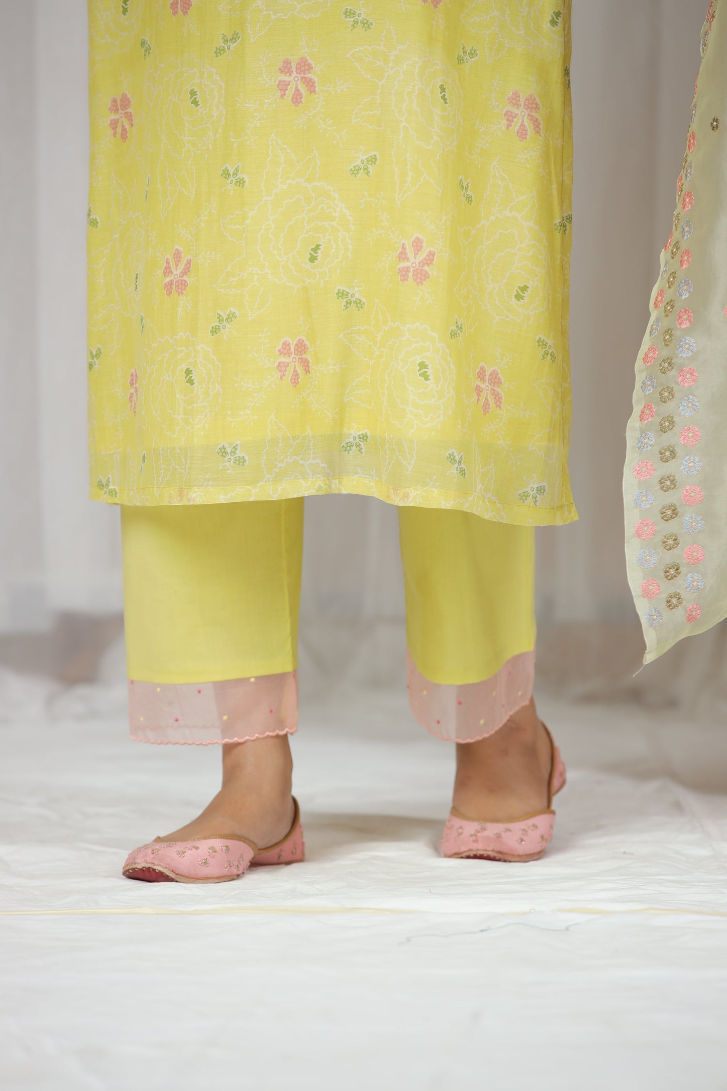 Fine chanderi printed kurta set with delicate neck detail and organza embroidered dupatta