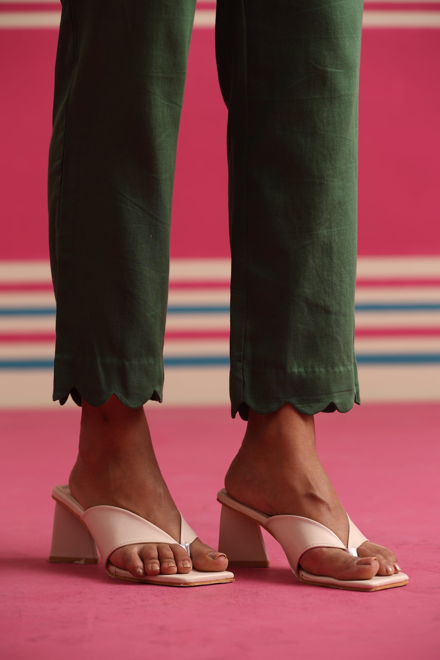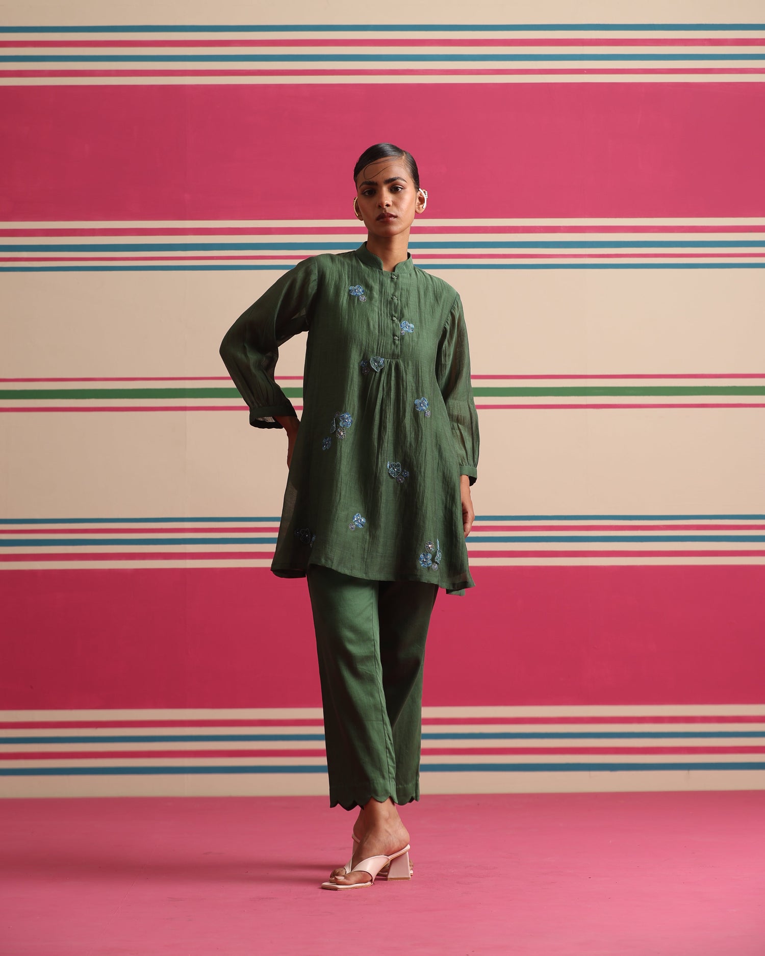 Pure mul chanderi top with floral applique and embroidery highlighted with hand tucked motis and sequins paired with pure cotton satin scallop pants.