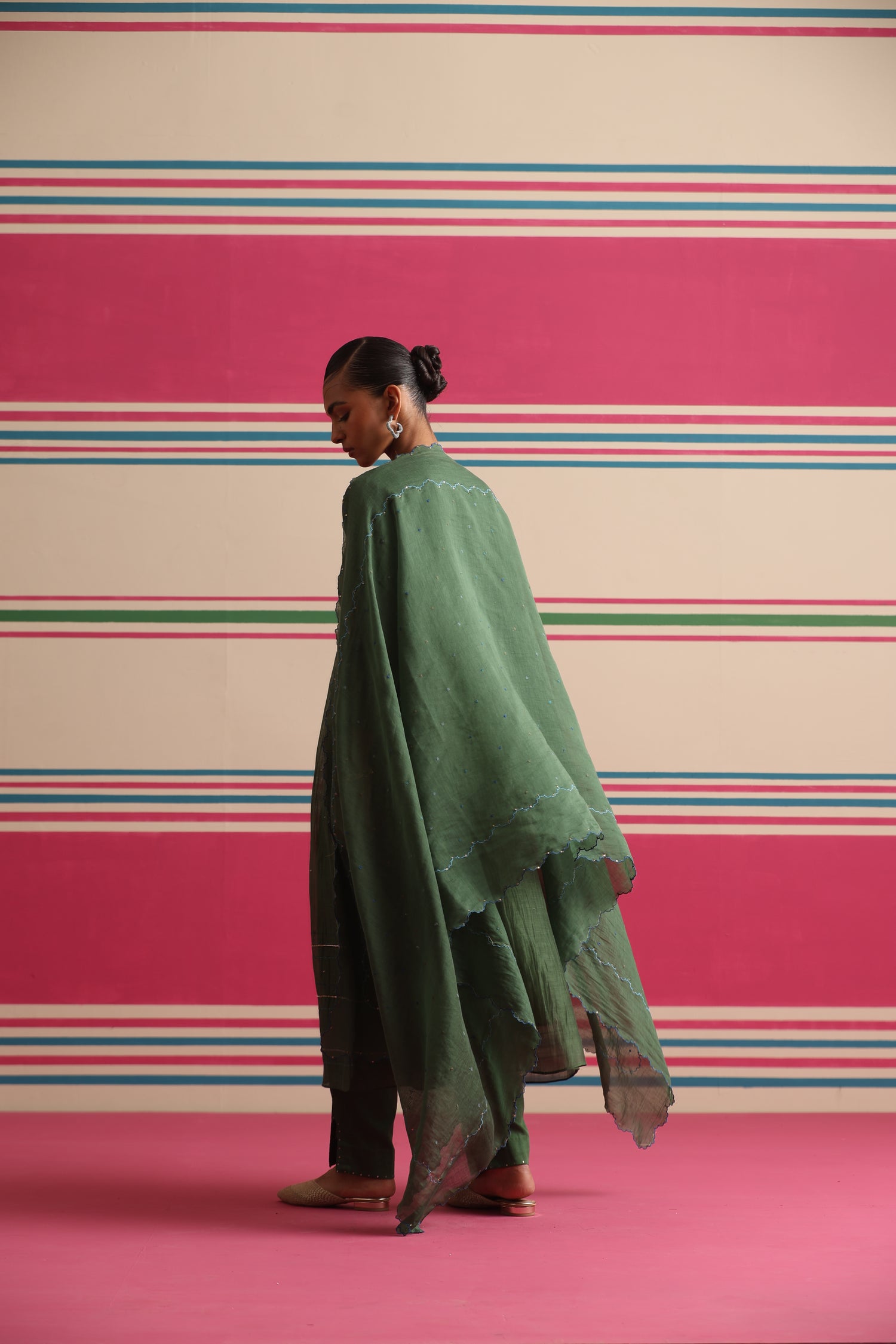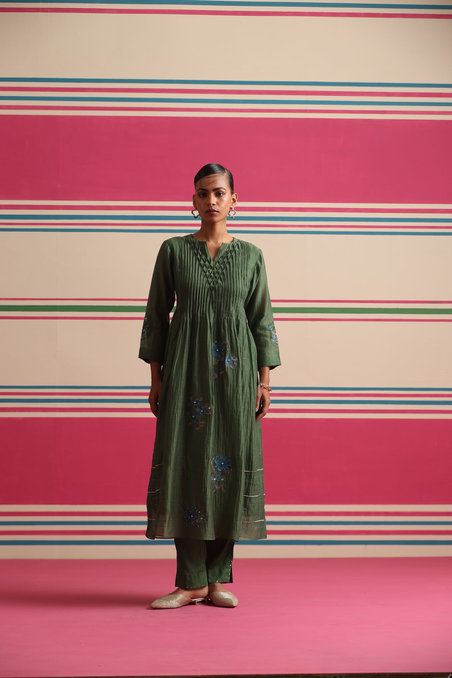 Pure mul chanderi kurta with floral embroidery highlighted with hand tucked sequins and motis paired with pure cotton satin pants and pure mul chanderi scallop dupatta highlighted with hand tucked motis and sequins.
