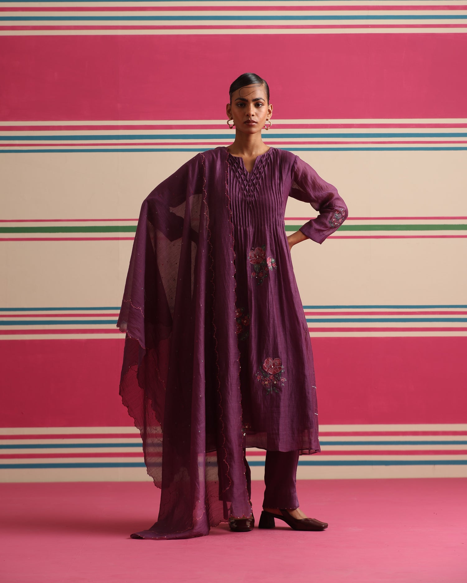 Pure mul chanderi kurta with floral embroidery highlighted with hand tucked sequins and motis paired with pure cotton satin pants and pure mul chanderi scallop dupatta highlighted with hand tucked motis and sequins.