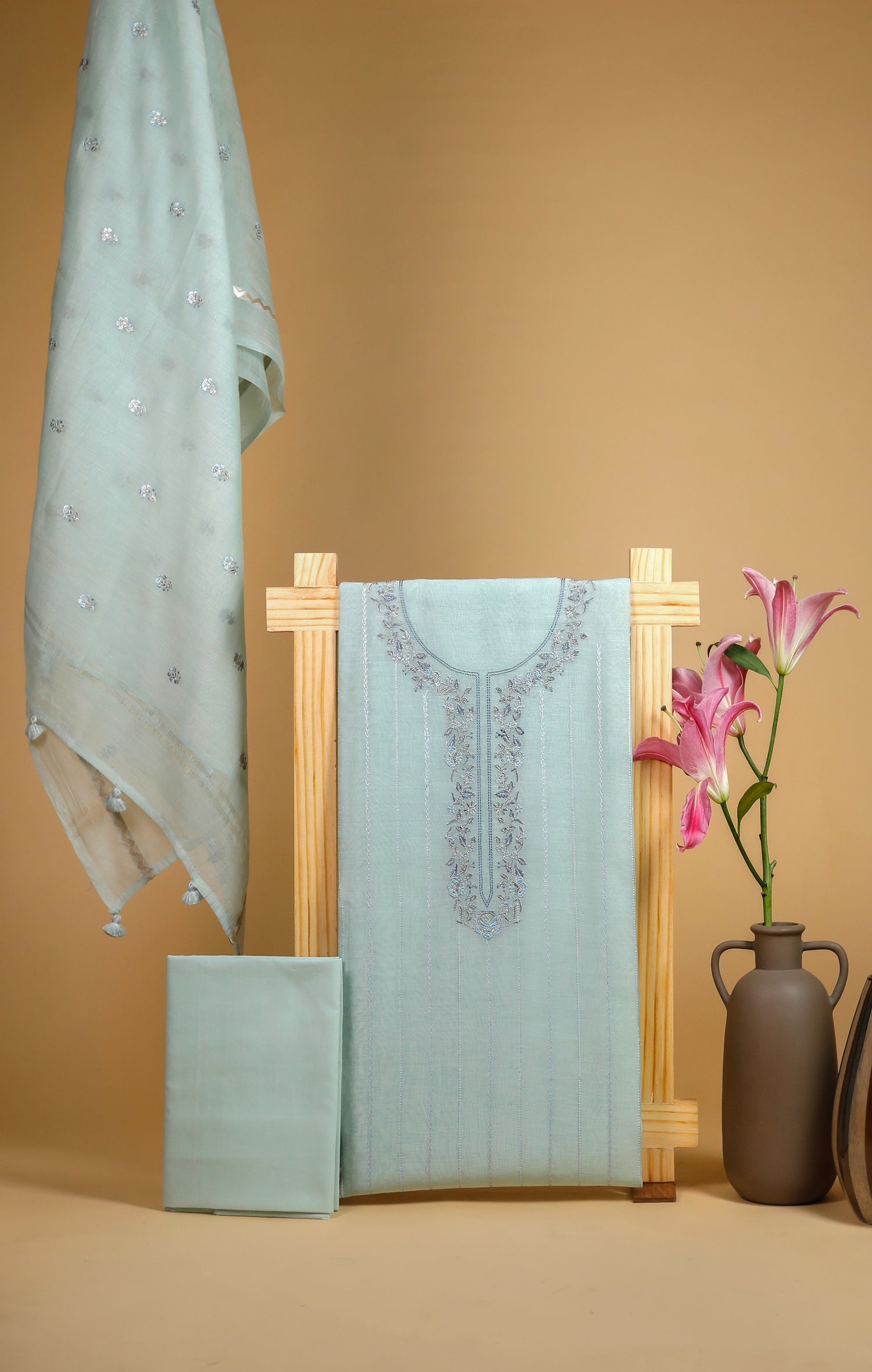 Pure Mul Chanderi Neck Embroidered Suit Piece - Blue