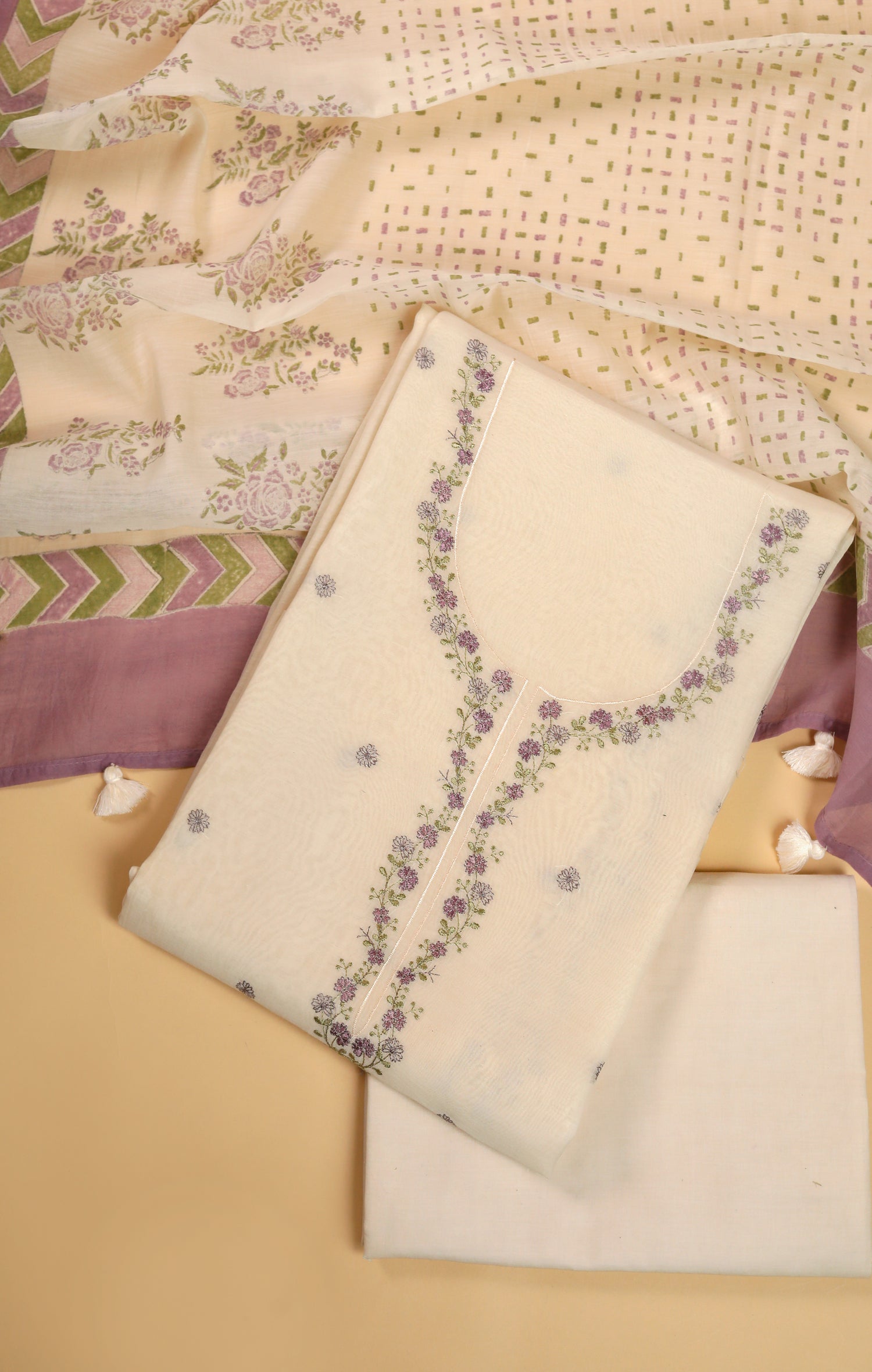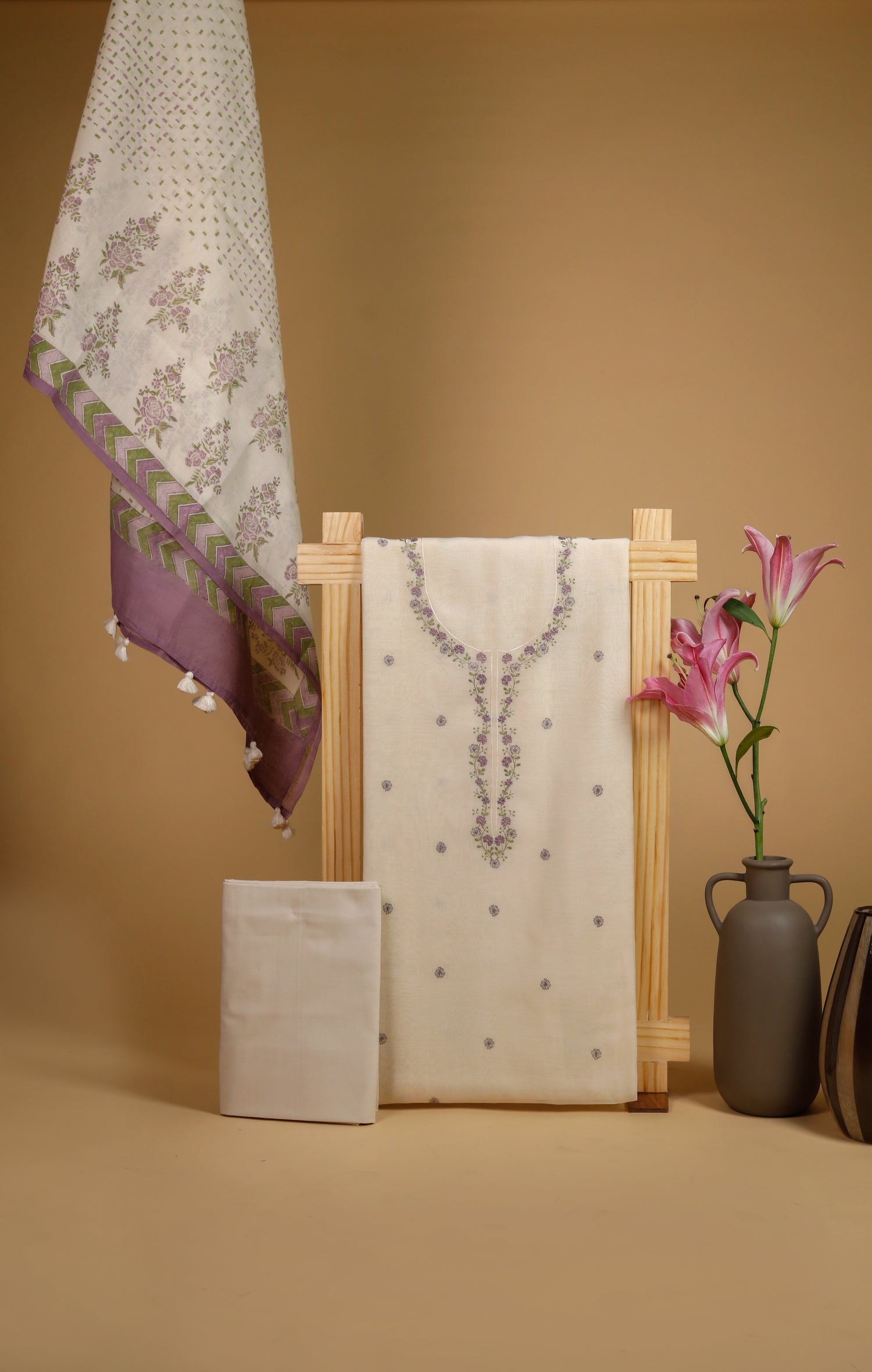 Pure Mul Chanderi Offwhite Neck Embroidered Suit Set - Purple