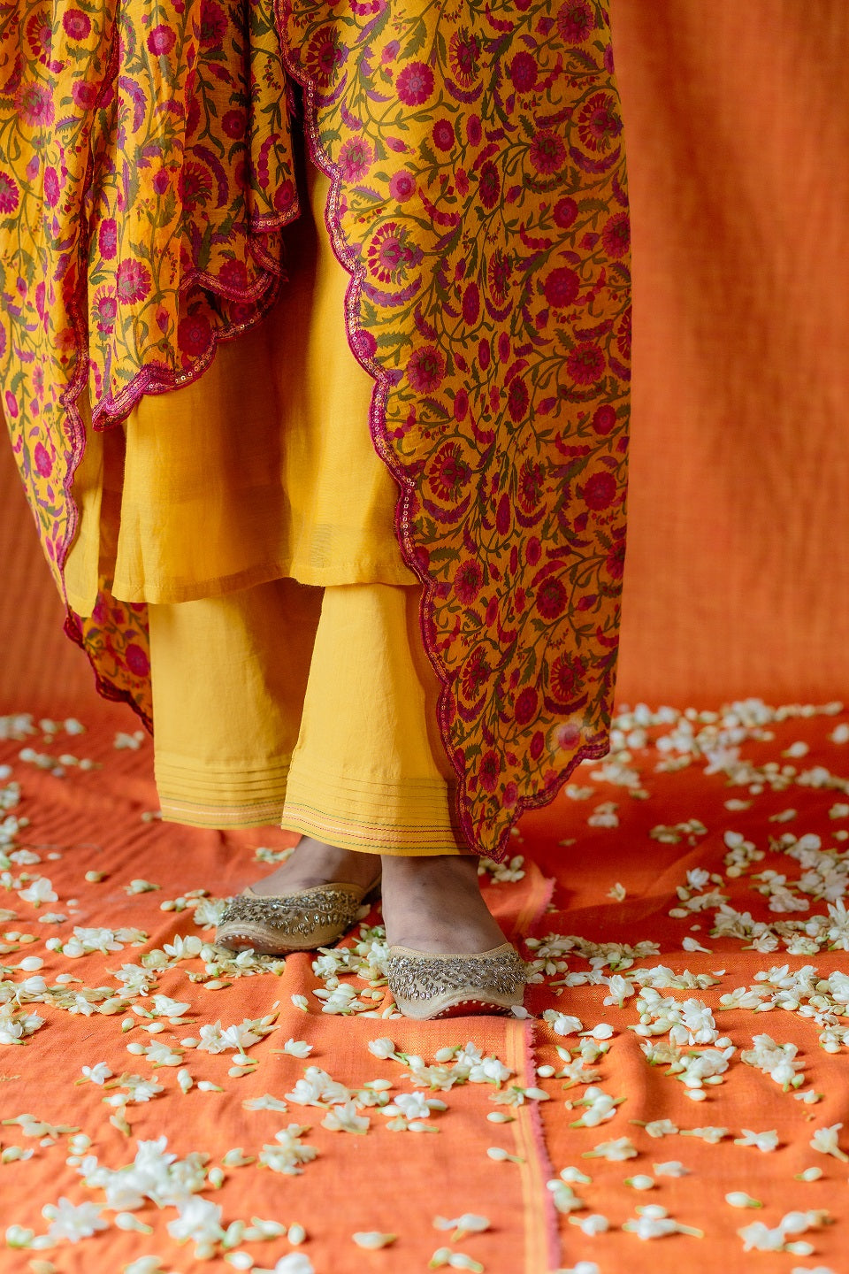 Mustard chanderi flared kurta with embroidered side panels and sleeves paired with printed chanderi scallop dupatta with cotton pants.
