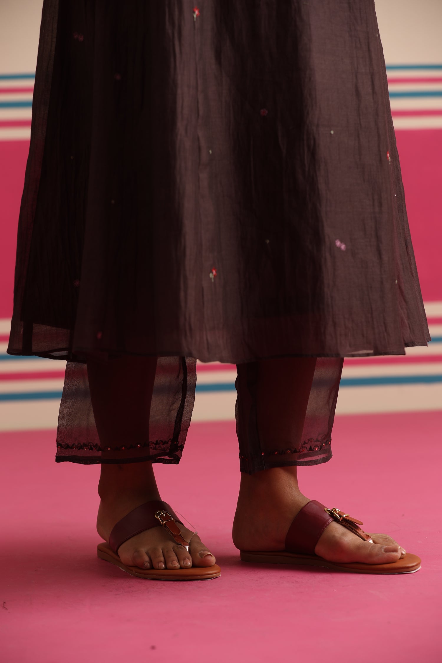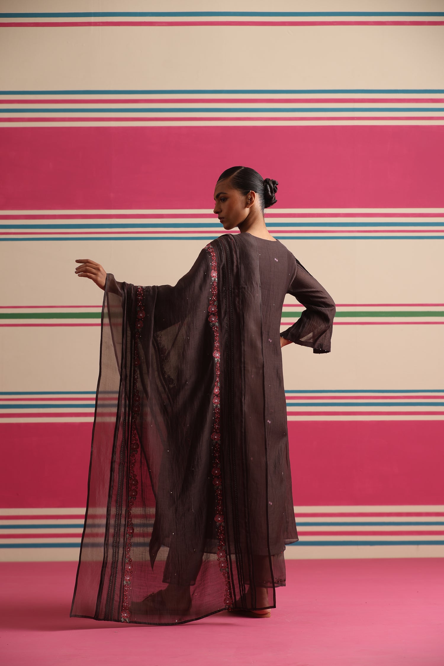 Pure mul chanderi kurta with floral embroidery highlighted with hand tucked sequins and motis paired with pure cotton satin pants with oraganza patch and pure mul chanderi floral dupatta with organza border highlighted with hand tucked motis and sequins.